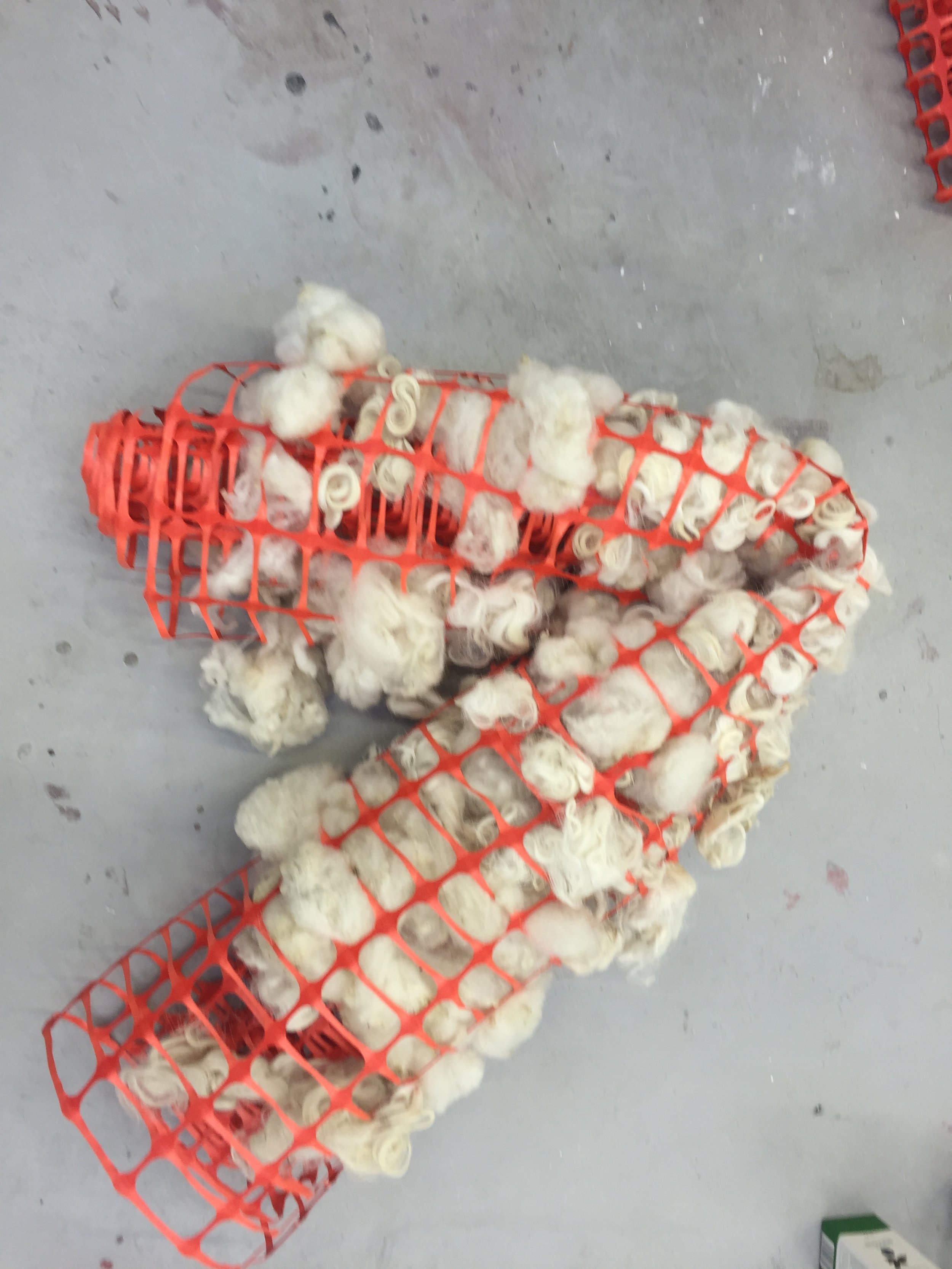 This artwork was created for the Gustav Metzgar collaborative exhibition on Nature. The piece was a labour intensive. I utilized the builder’s mesh as a base and metafore to the building industry. The four sheep fleeces were meticulously cleaned, by picking out all the dirt, and then hand-washing them outside in an old tub, they needed several washes and rinses. The water used was repurposed to water the garden. The fleece was hung on a washing line to dry out in the sun, and then after a few test pieces, it was decided to hand weave the fleece into the mesh in situ.